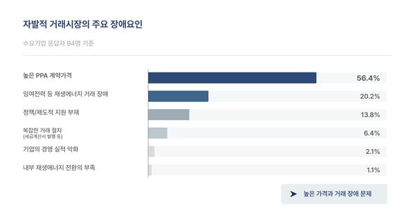 이날 공개한 데이터에 따르면 수요기업의 과반인 56.4%가 자발적 거래시장의 가장 큰 장애 요인으로 ‘높은 PPA 계약가격’을 꼽았다. 기업들은 현재의 PPA 가격을 일시적인 변동이 아닌 공급 제약과 과도한 인허가 절차가 빚어낸 ‘구조적 고점’으로 인식하고 있는 것으로 확인됐다.