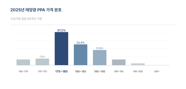 실제로 수요기업이 체감한 2025년 태양광 PPA 가격(발전사-수요기업 계약 기준)은 175~180원/kWh 구간(44.9%)과 180~185원/kWh 구간(26.5%)에 집중 형성되며 전반적인 가격 상승 압력을 보였다.