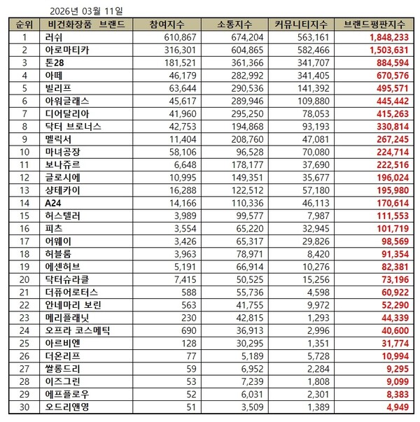 2026년 3월 비건화장품 브랜드평판 순위는 러쉬, 아로마티카, 톤28, 아떼, 빌리프, 아워글래스, 디어달리아, 닥터 브로너스, 멜릭서, 마녀공장, 보나쥬르, 글로시에, 샹테카이, A24, 허스텔러, 피츠, 어웨이, 허블룸, 에센허브, 닥터슈라클, 더퓨어로터스, 안네마리 보린, 메리플래닛, 오프라 코스메틱, 아르비엔, 더온리프, 쌀롱드리, 이즈그린, 에프플로우, 오드리앤영 순으로 분석됐다.