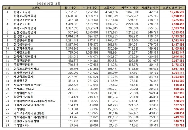 한국도로공사, 국토교통부 공공기관 2026년 3월 브랜드평판 1위