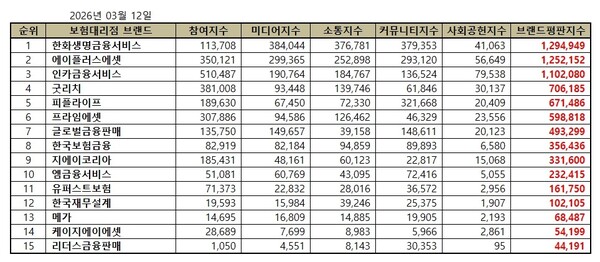 한국기업평판연구소는 2026년 2월 12일부터 2026년 3월 12일까지 15개 보험대리점 브랜드 빅데이터 7,470,152개를 분석한 결과 지난 2월 보험대리점 브랜드 빅데이터 7,590,809개와 비교하면 1.59% 줄어들었다고 밝혔다.