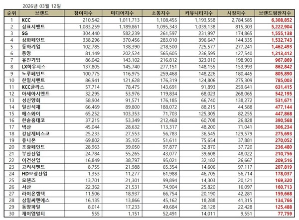 건축자재 상장기업 브랜드평판 2026년 3월 빅데이터 분석 30위 순위는 KCC, 삼표시멘트, SG, 삼화페인트, 동화기업, 동양, 유진기업, LX하우시스, 노루페인트, 한일시멘트, KCC글라스, 아세아시멘트, 성신양회, 일신석재, 에스와이, 한솔홈데코, 벽산, 강남제비스코, 유니온, 조광페인트, 부산산업, 이건산업, 고려시멘트, HD보광산업, 모헨즈, 서산, 라이온켐텍, 삼일씨엔에스, 동양파일, 제이엠멀티 순이었다.