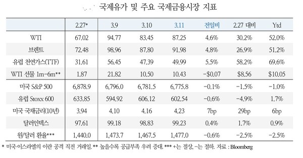 국제금유센터는 중동 사태 및 국제유가 동향을 통해 WTI 가격이 11일 기준 배럴당 87.25달러로 전일 대비 4.6% 상승했다고 밝혔다.