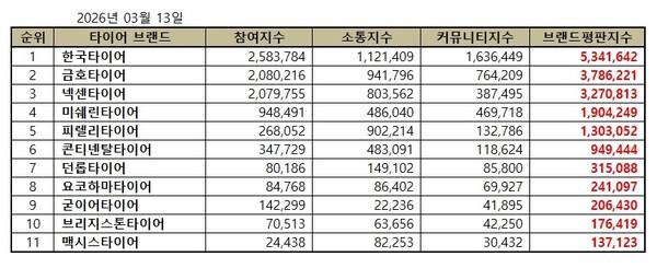 2026년 3월 타이어 브랜드평판 순위는 한국타이어, 금호타이어, 넥센타이어, 미쉐린타이어, 피렐리타이어, 콘티넨탈타이어, 던롭타이어, 요코하마타이어, 굳이어타이어, 브리지스톤타이어, 맥시스타이어 순으로 분석됐다.