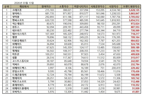 2026년 3월 게임 상장기업 브랜드평판 순위는 크래프톤, 펄어비스, 넷마블, 엔씨소프트, 넥슨게임즈, 컴투스, 네오위즈, 데브시스터즈, 웹젠, 더블유게임즈, 위메이드, 조이시티, 엠게임, 미투온, 넵튠, 고스트스튜디오, 넥써쓰, 위메이드맥스, 한빛소프트, 드래곤플라이, 썸에이지, 액토즈소프트, 플레이위드, 위메이드플레이, 모비릭스 순으로 분석됐다.