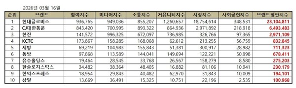 2위, CJ대한통운 브랜드는 참여지수 843,420 미디어지수 700,995 소통지수 893,322 커뮤니티지수 864,936 시장지수 2,971,892 사회공헌지수 218,918이 되면서 브랜드평판지수 6,493,483으로 분석됐다. 지난 2월 브랜드평판지수 4,702,702와 비교해보면 38.08% 상승했다.