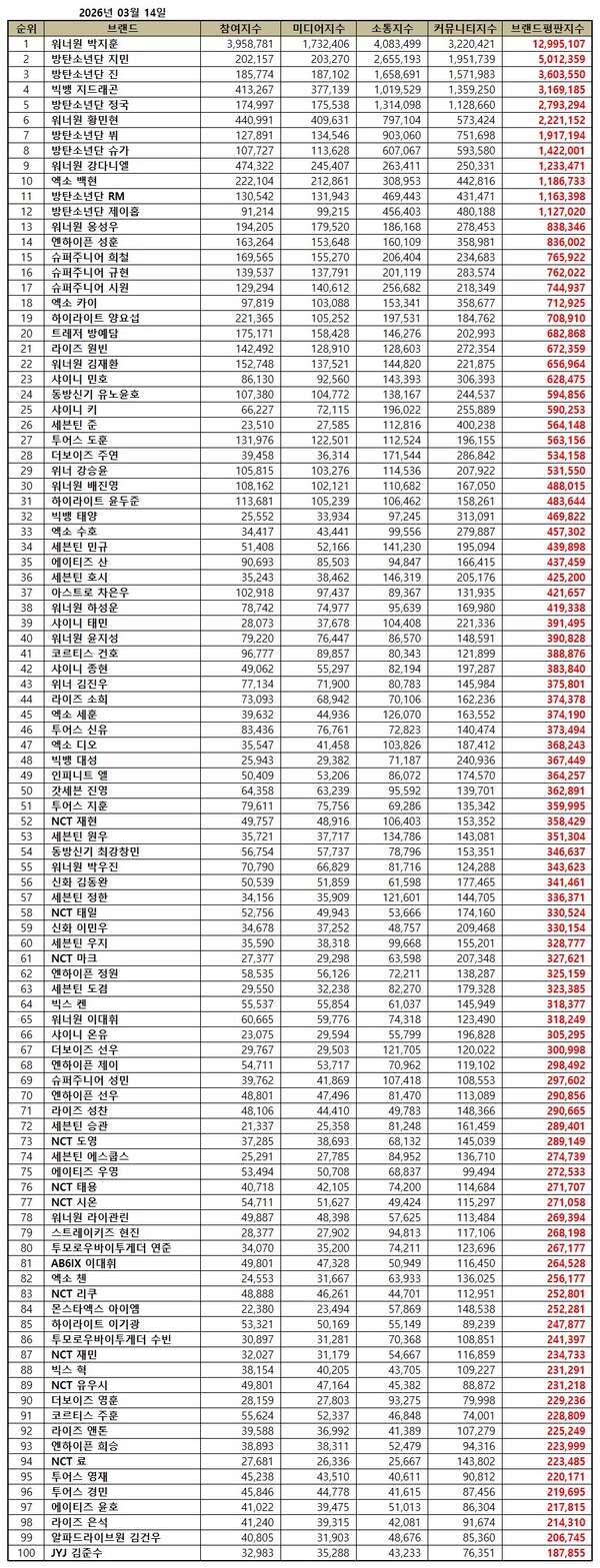 보이그룹 개인 2026년 3월 브랜드평판...워너원 박지훈, 방탄소년단 지민, 방탄소년단 진 順