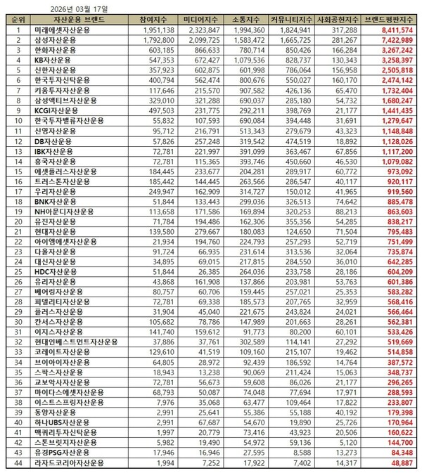 한국기업평판연구소는 2026년 2월 17일부터 2026년 3월 17일까지의 44개 자산운용사 브랜드 빅데이터 53,670,244개를 분석하여 소비자들의 참여와 미디어, 소통, 커뮤니티, 사회공헌지표를 측정하여 평판 알고리즘을 통해 지수화한 결과 지난 2월 브랜드 빅데이터 47,428,355개와 비교하면 13.16% 증가했다고 밝혔다.
