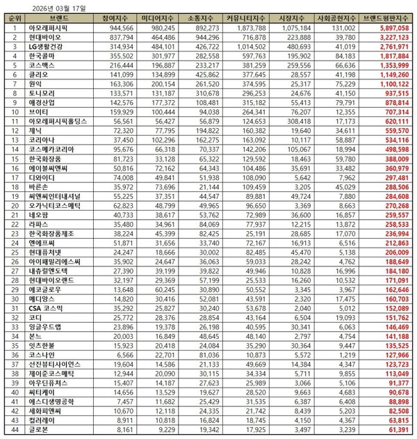 한국기업평판연구소는 국내 화장품 상장기업에 대해 2026년 2월 17일부터 2026년 3월 17일까지의 화장품 상장기업 브랜드 빅데이터 27,544,971개를 분석한 결과 지난 2월 화장품 상장기업 브랜드 빅데이터 16,993,978개와 비교하면 62.09% 증가했다고 밝혔다.