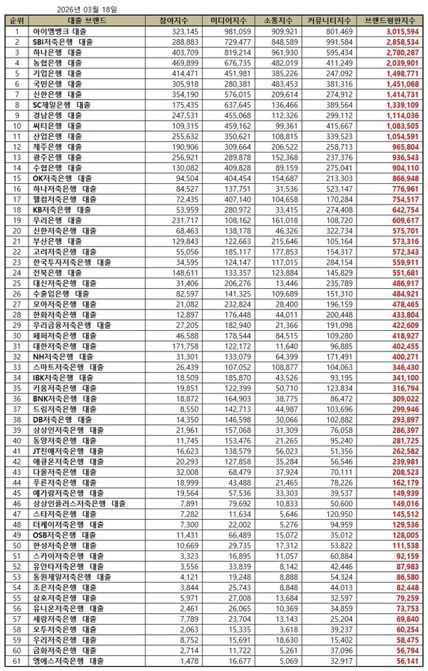 2026년 3월 대출 브랜드평판 30위 순위는 아이엠뱅크, SBI저축은행, 하나은행, 농협은행, 기업은행, 국민은행, 신한은행, SC제일은행, 경남은행, 씨티은행, 산업은행, 제주은행, 광주은행, 수협은행, OK저축은행, 하나저축은행, 웰컴저축은행, KB저축은행, 우리은행, 신한저축은행, 부산은행, 고려저축은행, 한국투자저축은행, 전북은행, 대신저축은행, 수출입은행, 모아저축은행, 한화저축은행, 우리금융저축은행, 페퍼저축은행 대출 순으로 나타났다.