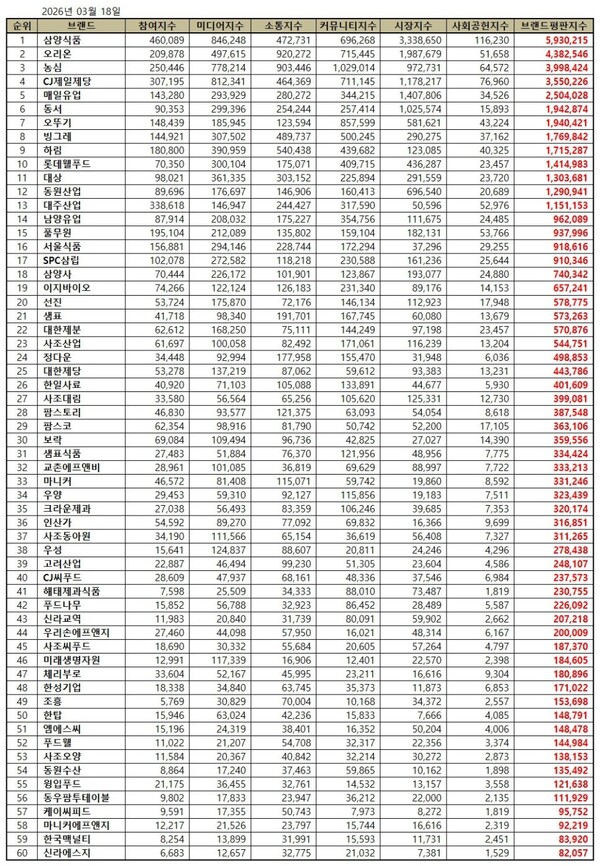 한국기업평판연구소는 식품 상장기업 60개 브랜드에 대해 2026년 2월 18일부터 2026년 3월 18일까지의 식품 상장기업 브랜드 빅데이터 49,222,265개를 분석한 결과 지난 2월 식품 상장기업 브랜드 빅데이터 46,287,211개와 비교하면 6.34% 증가했다고 밝혔다.