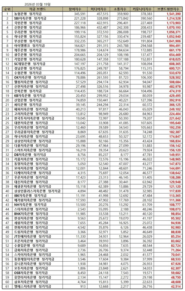 한국기업평판연구소는 61개 정기적금 브랜드에 대해 2026년 2월 19일부터 2026년 3월 19일까지의 정기적금 브랜드 빅데이터 20,865,816개를 분석한 결과 지난 2월 정기적금 브랜드 빅데이터 19,943,317개와 비교하면 4.63% 증가했다고 밝혔다.