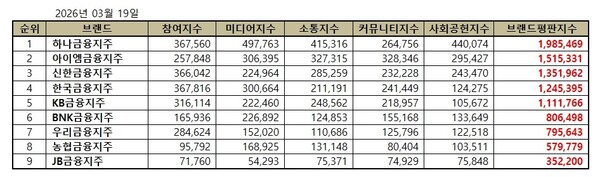 금융지주회사 브랜드평판 2026년 3월 순위는 하나금융지주, 아이엠금융지주, 신한금융지주, 한국금융지주, KB금융지주, BNK금융지주, 우리금융지주, 농협금융지주, JB금융지주 순이었다.