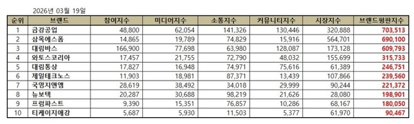 건축제품 상장기업 2026년 3월 브랜드평판...금강공업, 삼목에스폼, 대림바스 順
