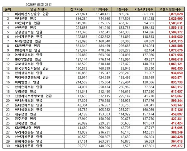 2026년 3월 연금 브랜드평판 30위 순위는 미래에셋자산운용, 하나은행, KB손해보험, 신한은행, 삼성생명보험, 삼성자산운용, NH농협은행, KB국민은행, DB손해보험, 농협생명보험, IBK기업은행, 교보생명보험, 한국투자신탁운용, 한화생명보험, 미래에셋생명보험, 아이엠뱅크, 한화손해보험, 우리은행, 신한라이프생명보험, 하나손해보험, 롯데손해보험, 하나생명보험, 제주은행, 광주은행, 전북은행, KB생명보험, 우리자산운용, 신한자산운용, 한화자산운용, 현대자산운용 연금 순으로 나타났다.