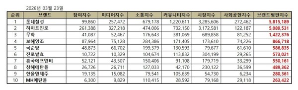 음료 상장기업 2026년 3월 브랜드평판...롯데칠성, 하이트진로, 무학 順