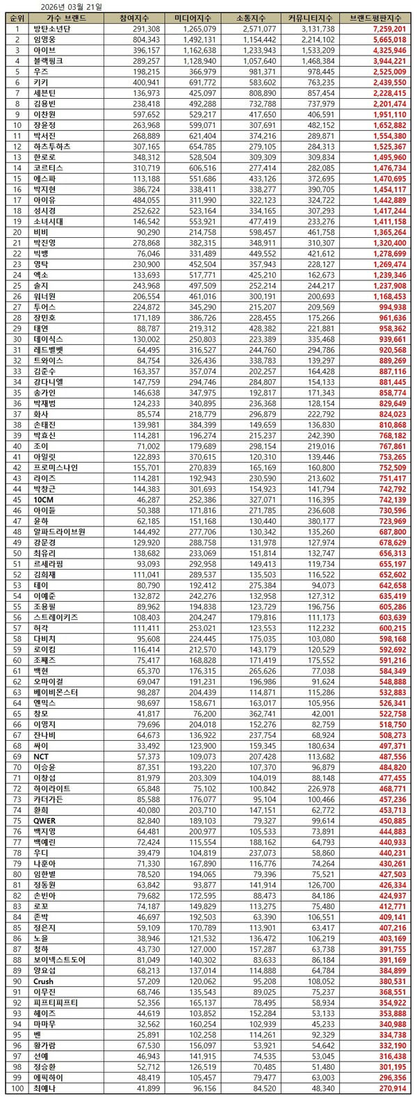 한국기업평판연구소는 2026년 2월 21일부터 2026년 3월 21일까지의 가수 브랜드 빅데이터 99,015,754개를 분석한 결과 지난 2월 가수 브랜드 빅데이터 105,145,096개와 비교하면 5.83% 줄어들었다고 밝혔다.