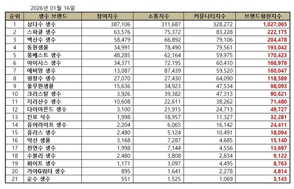 한국기업평판연구소는 국내 소비자들이 사랑받는 생수 브랜드 21개에 대해 지난 2025년 12월 16일부터 2026년 1월 16일까지 생수 브랜드 빅데이터 2,702,184개를 분석한 결과 지난 12월 생수 브랜드 빅데이터 3,222,677개와 비교하면 16.15% 줄어들었다고 밝혔다.