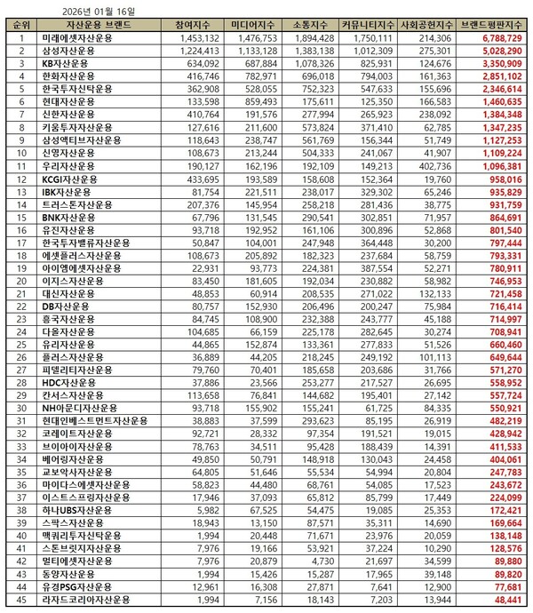 한국기업평판연구소는 2025년 12월 16일부터 2026년 1월 16일까지의 45개 자산운용사 브랜드 빅데이터 45,268,918개를 분석하여 소비자들의 참여와 미디어, 소통, 커뮤니티, 사회공헌지표를 측정하여 평판 알고리즘을 통해 지수화한 결과 지난 12월 브랜드 빅데이터 44,868,877개와 비교하면 0.89% 증가했다고 밝혔다.