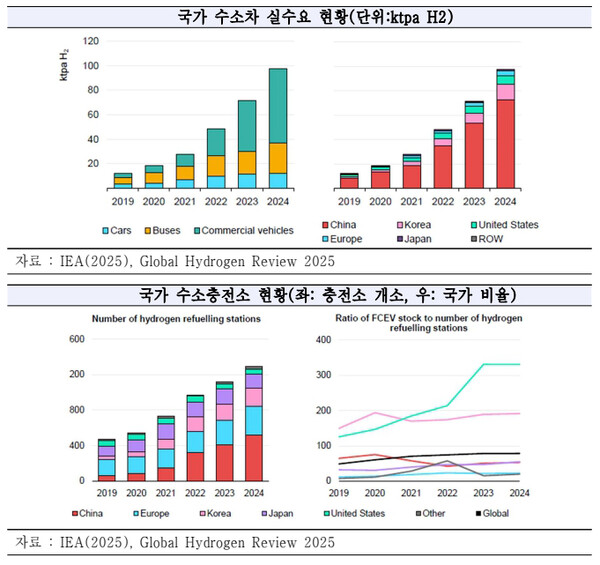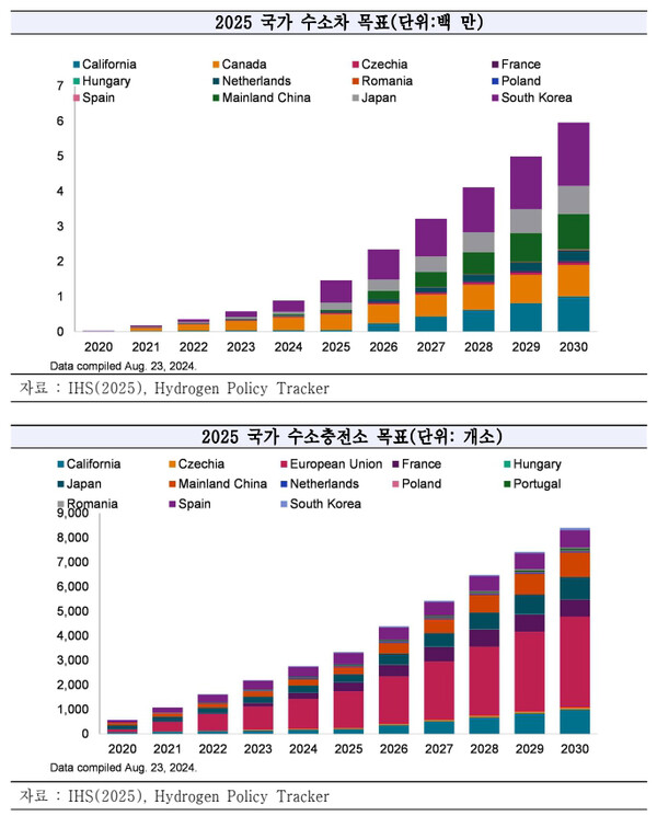 수소차 목표치가 2024년 누적 약 88만대인 것에 비해 실제로 2024년까지 누적 약 10만 대, 한 해 동안 5000대 이하의 수소연료전지 자동차가 판매됐고, 전 세계에 2024년 기준 약 1300개 이상의 충전소가 존재하는데 IHS(2025)에서 집계한 2024년 글로벌 정책 목표(2771개소)와 비교했을 때 절반에 미치지 못하는 수준임을 알 수 있다.