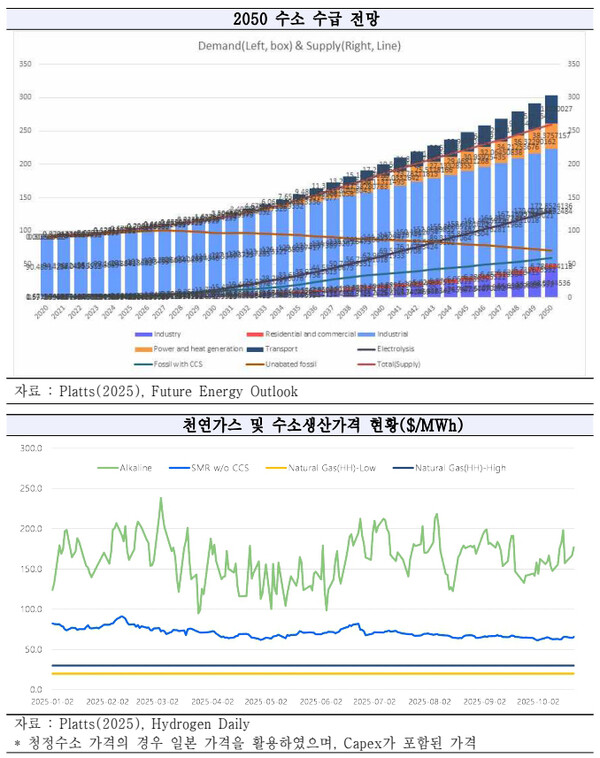 현재 청정수소 가격은 2025년 10월 기준 현재, 알칼라인 수전해 기술을 활용한 그린수소의 경우 $6/kg($177/MWh), 블루수소(개질수소 with CCS)가 $2.16/kg($65.5/MWh)로 천연가스 가격(헨리 허브)과 비교 시 최대 6배 가까운 수준까지 벌어지고 있다. 그만큼 기타 유인없이 수소 산업이 빠르게 성장하긴 어렵다는 것을 의미하고 있다.