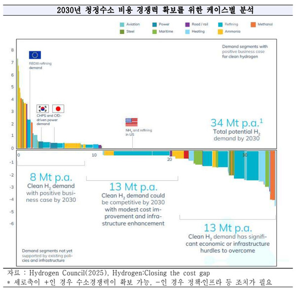 Hydrogen Council(2025)은 2025년 3월에 발표한 Hydrogen: Closing the cost gap 보고서에서 2030년 청정수소 잠재 수요량인 3400만톤의 보급을 위한 수소 비용 격차 감축 방안으로 지역별 정책 인센티브, 에너지 가격 격차, 인프라 현황에 대한 강력한 조치가 필요하다고 분석하고 있다.