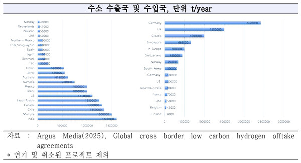 특이점으로 2025년 인도의 수소 수출 잠재량이 가장 높게 평가됐으며, 기존 잠재 수출강국으로 평가되던 호주의 경우 수소 프로젝트 중단으로 인한 잠재 생산량이 500만톤이 넘어 수출 예상국 순위의 하위에 자리잡고 있다.