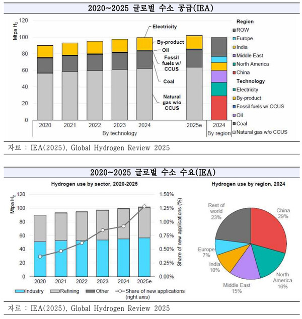 반면 저탄소 수소 생산량은 아직도 전 세계 생산량의 1% 미만 수준(IEA기준 2024년 약 80만 톤)인 것으로 확인됐다.