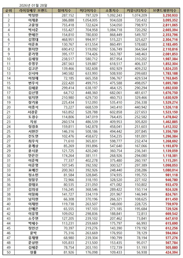 한국기업평판연구소는 2025년 12월 28일부터 2026년 1월 28일까지 측정한 라이징 배우 브랜드 빅데이터 70,488,898개를 소비자 행동분석을 통해 라이징 배우 브랜드에 대한 참여지수, 미디어지수, 소통지수, 커뮤니티지수를 측정한 결과 지난 12월 라이징 배우 브랜드빅데이터 53,171,721개와 비교하면 32.57% 증가했다고 밝혔다.