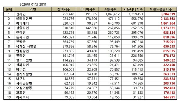 2026년 1월 라면 브랜드평판 순위는 신라면, 불닭볶음면, 짜파게티, 삼양라면, 진라면, 틈새라면, 진짬뽕, 육개장 사발면, 안성탕면, 열라면, 팔도비빔면, 참깨라면, 왕뚜껑, 김치사발면, 너구리, 사리곰탕면, 오징어짬뽕, 꼬꼬면, 짜짜로니 순으로 나타났다.