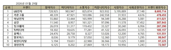 전자제품 상장기업 2026년 1월 브랜드평판...LG전자, 가온그룹, 아남전자 順