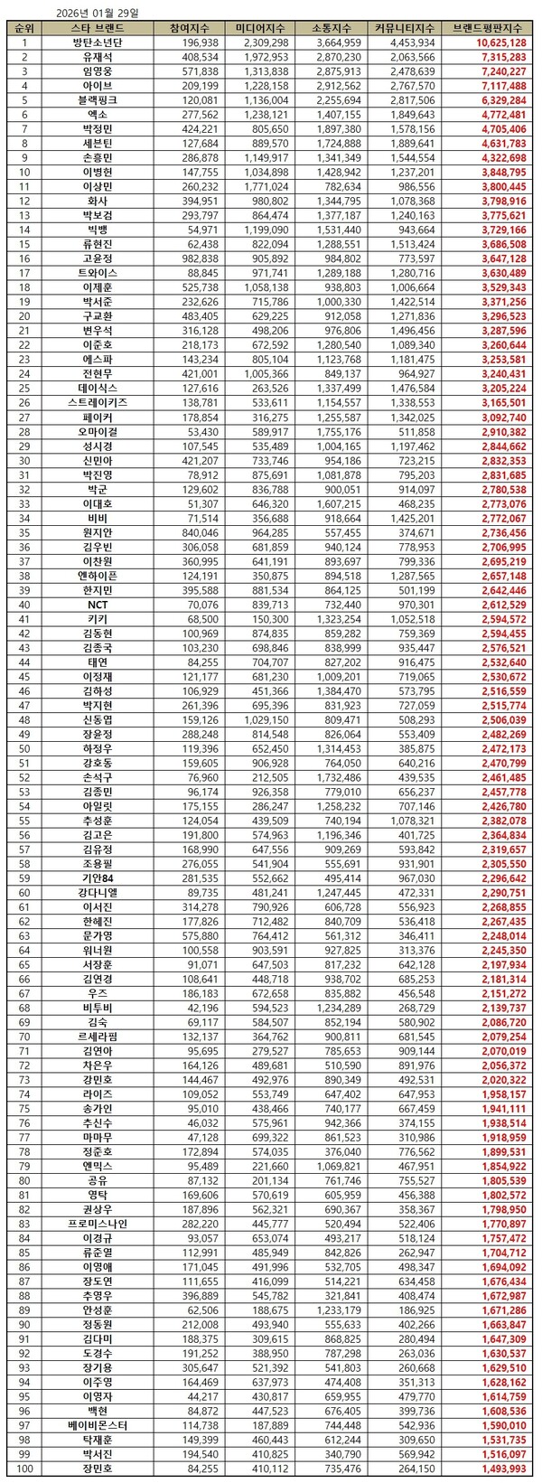 2026년 1월 스타 브랜드평판 30위 순위는 방탄소년단, 유재석, 임영웅, 아이브, 블랙핑크, 엑소, 박정민, 세븐틴, 손흥민, 이병헌, 이상민, 화사, 박보검, 빅뱅, 류현진, 고윤정, 트와이스, 이제훈, 박서준, 구교환, 변우석, 이준호, 에스파, 전현무, 데이식스, 스트레이키즈, 페이커, 오마이걸, 성시경, 신민아 순으로 분석됐다.
