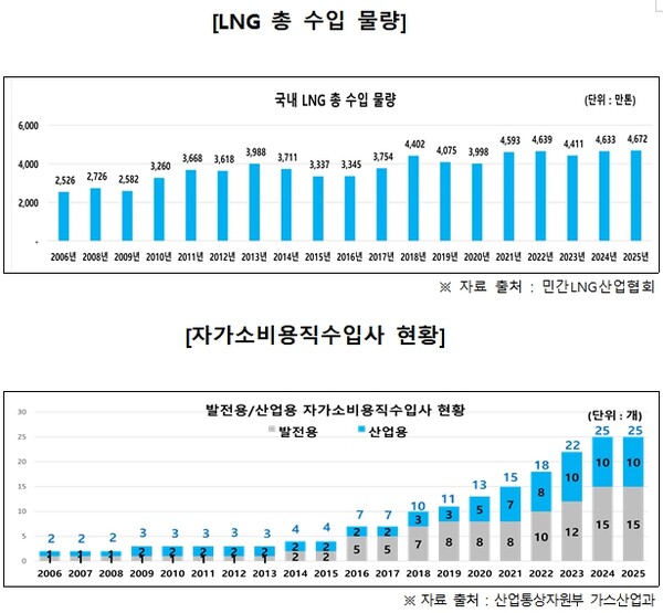 2025년 국내 LNG 총 수입 물량은 역대 최대를 기록하며 기존 최대였던 2022년 4639만톤을 소폭 넘어선 것이며, 전년 4633만톤보다 0.8% 증가한 양이다.