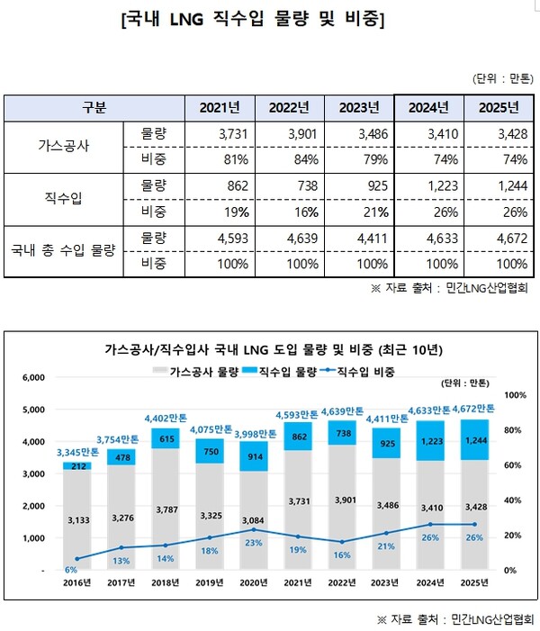 29일 민간LNG산업협회의 ’2025년 LNG 직수입 실적 통계‘ 에 따르면 지난해 국내 LNG 총 수입량은 한국가스공사 3428만톤(74%), 직수입 1244만톤(26%) 등 총 4672만톤이다.