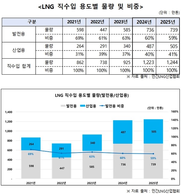 LNG 직수입사의 용도별 물량과 비중을 보면 발전용은 739만톤으로 전년 대비 0.4% 증가했고, 산업용은 505만톤으로 전년 대비 3.8% 증가했다. LNG 직수입 용도별 물량은 발전용이 59%, 산업용이 41%를 차지하고 있는 것이다.