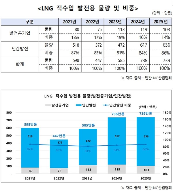발전공기업의 경우 향후 석탄화력발전소의 LNG 전환과 신규 LNG 발전기 도입이 예정돼 있어 LNG 직수입 물량이 지속적으로 증가할 것으로 전망된다. 민간발전의 경우 2024년 건설된 발전기의 LNG 도입 증가로 전년 대비 19만톤이 증가했다.