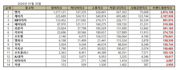 2026년 1월 중고차 브랜드평판 순위는 엔카, 케이카, KB차차차, 헤이딜러, 리본카, 카모아, 오토벨, 엠파크, 첫차, 카옥션, 오토플러스, AJ셀카, 비마이카, 카넷 순으로 나타났다.