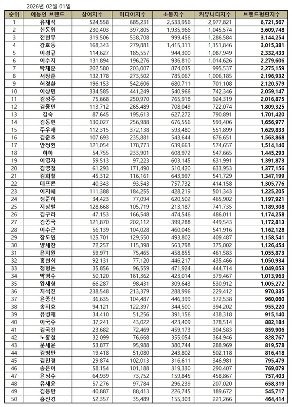 한국기업평판연구소는 2026년 1월 1일부터 2026년 2월 1일까지의 예능방송인 50명의 브랜드 빅데이터 75,094,290개를 분석하여 소비자들의 예능 방송인 브랜드 참여량, 미디어량과 소비자의 참여와 소통량, 소셜에서의 대화량을 측정한 결과 지난 1월 예능방송인 브랜드 빅데이터 57,033,913개와 비교하면 31.67% 증가했다고 밝혔다.