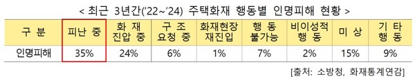 또한 화재로 인한 인명피해 중 사망 62%(576명), 부상 44%(2,896명)가 주택에서 발생했고 인명피해의 35%가 피난 중에 발생했다.