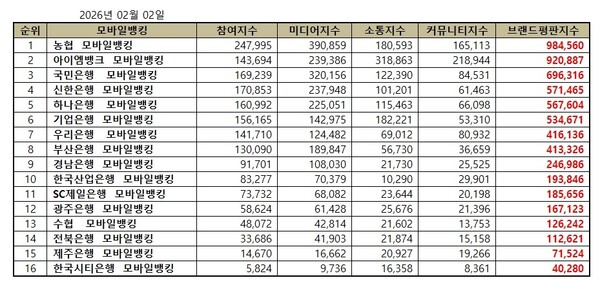 2026년 2월 모바일뱅킹 브랜드평판 순위는 농협, 아이엠뱅크, 국민은행, 신한은행, 하나은행, 기업은행, 우리은행, 부산은행, 경남은행, 한국산업은행, SC제일은행, 광주은행, 수협, 전북은행, 제주은행, 한국시티은행 모바일뱅킹 순이었다.
