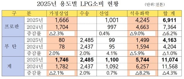 한국석유공사, SK가스와 E1 등 LPG수입사에서 집계한 2025년 용도별 LPG소비 현황에 따르면 지난해 국내에서 판매된 LPG는 프로판이 691만1000톤, 부탄이 416만3000톤 등 1107만4000톤으로 전년 동기 1156만8000톤에 비해 49만4000톤이 감소한 것으로 나타났다.