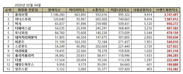 한국기업평판연구소는 2026년 2월 빅데이터 분석은 2026년 1월 4일부터 2026년 2월 4일까지의 화장품 전문점 브랜드 빅데이터 10,383,862개를 분석한 결과 지난 1월 화장품 전문점 브랜드 빅데이터 12,024,588개와 비교해보면 13.64% 줄어들었다고 밝혔다.