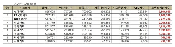 한국기업평판연구소는 2026년 1월 4일부터 2026년 2월 4일까지의 국내 신용카드 브랜드 빅데이터 17,581,593개를 분석하여 소비자들의 참여와 미디어, 소통, 커뮤니티, 사회공헌, CEO 지표를 측정한 결과 지난 1월 신용카드 브랜드 빅데이터 16,786,829개와 비교하면 4.73% 증가했다고 밝혔다.
